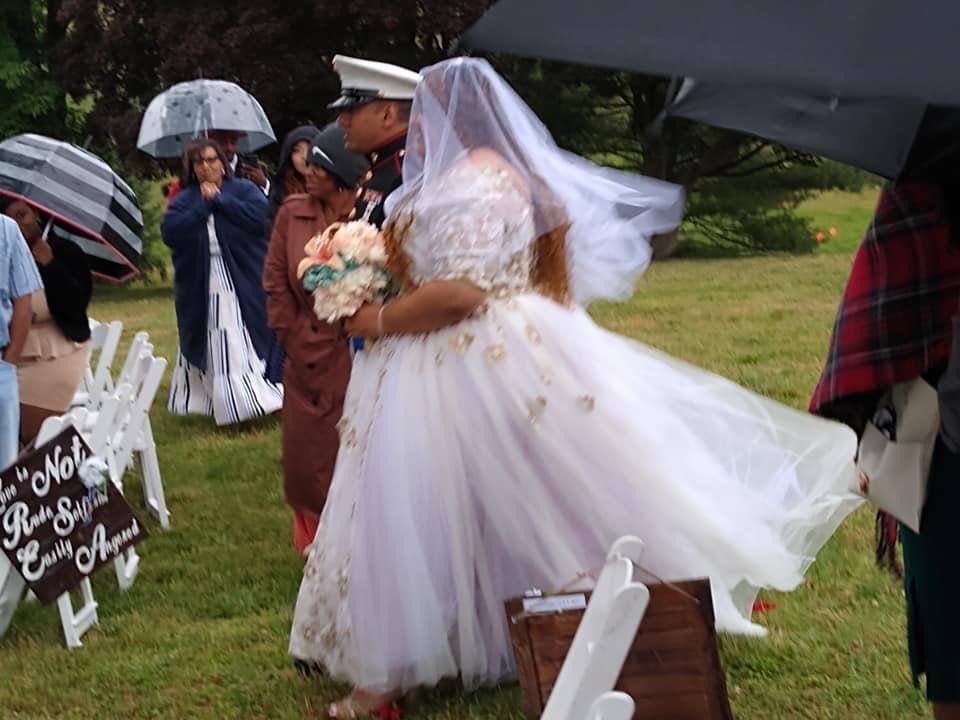 The bride was walked down the aisle by her brother, a soldier in the Marines.