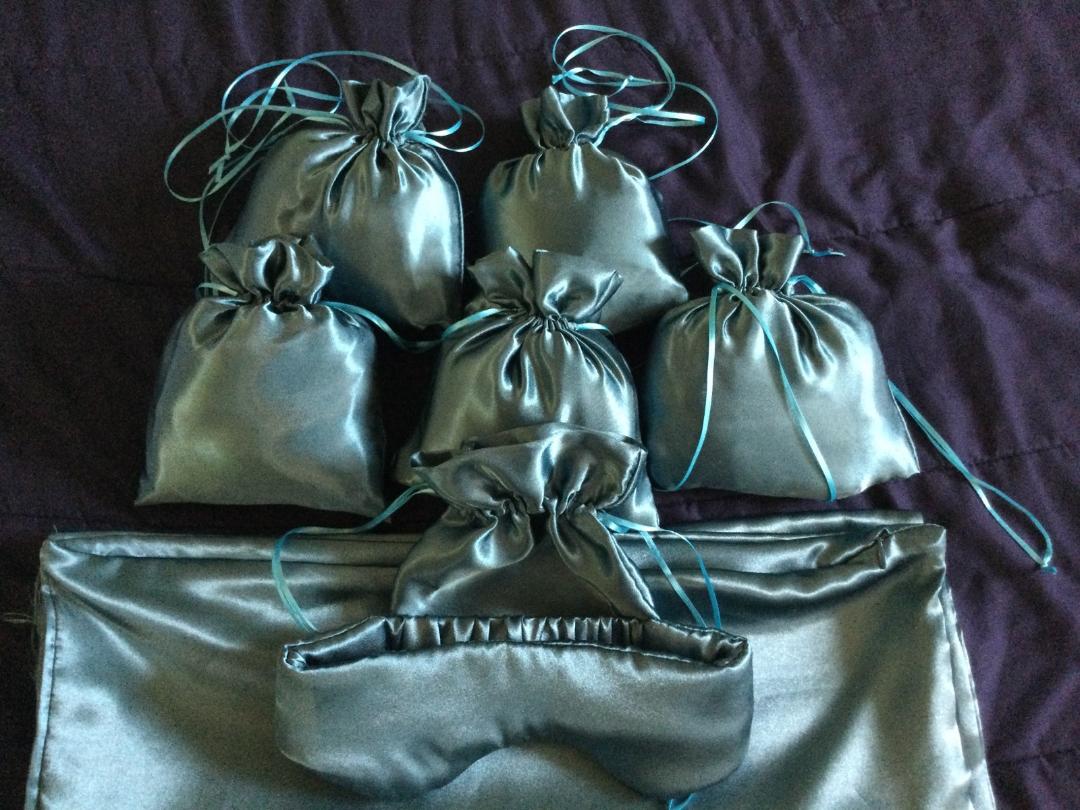 These are satin sleeping masks with matching pillow cases in a drawstring bag. These felt great, totally shutting out light, and looked absolutely glamorous. Call Bobby for her prices and availability.